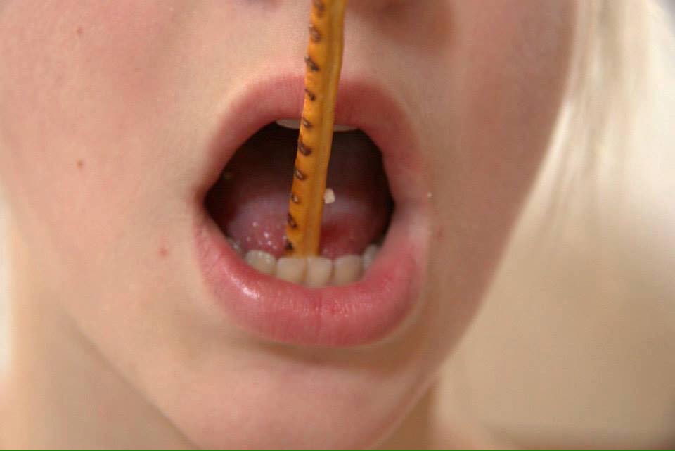 szerokiego języka kilka sekund na podniebieniu, przy szeroko otwarty ustach.